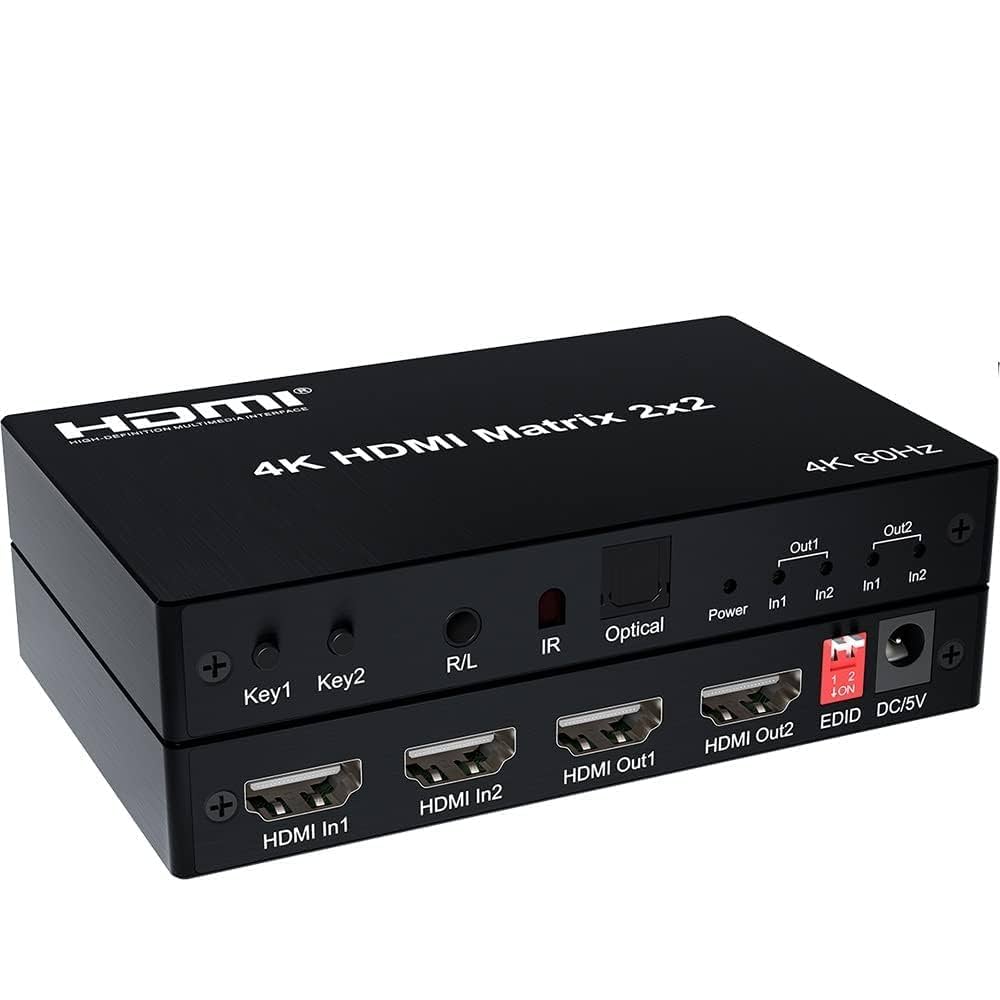 chuyển mạch HDMI Matrix 2 vào 2 ra cho phép bạn kết nối 2 nguồn HDMI và chia tín hiệu tới 2 màn hình. Bạn có thể chọn từng nguồn xuất ra từng màn hình khác nhau qua nút bấm, remote IR hoặc cổng RS232.