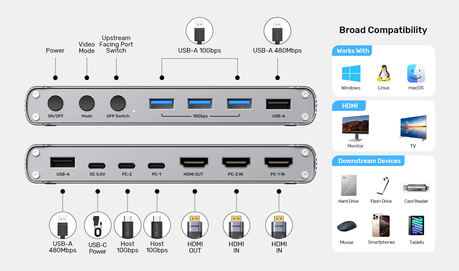 Khả năng tương thích rộng rãi, hoạt động liền mạch với các hệ điều hành Windows, Linux và macOS. Với nhiều cổng USB-A và kết nối HDMI, sản phẩm hỗ trợ nhiều loại thiết bị, bao gồm ổ cứng, ổ đĩa flash và màn hình. Tính linh hoạt này đảm bảo bạn có thể dễ dàng quản lý tất cả các thiết bị ngoại vi, giúp quy trình làm việc của bạn hiệu quả và hợp lý hơ