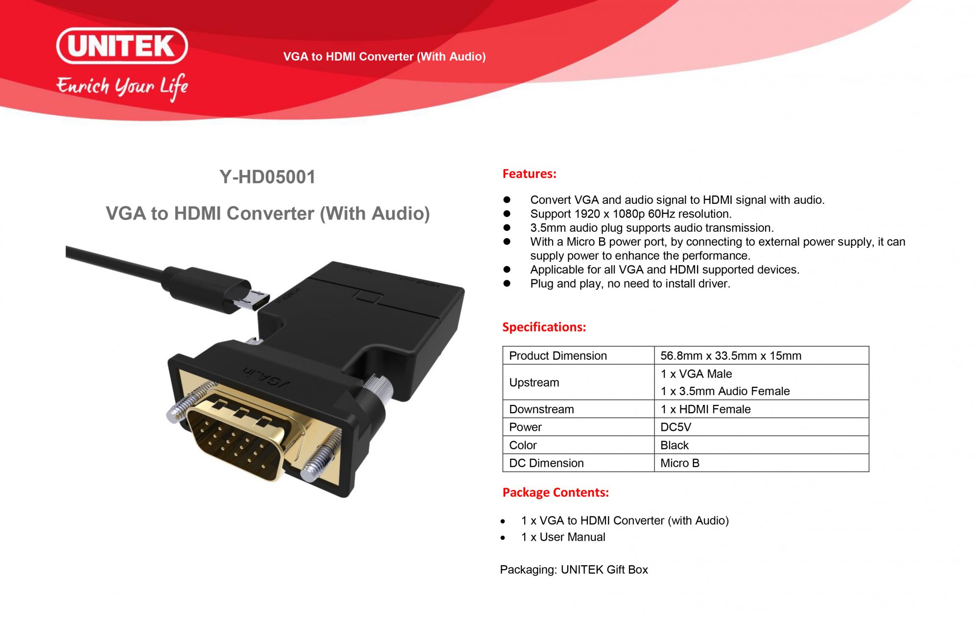 Đầu Chuyển đổi VGA + AUDIO -> HDMI UNITEK Y-HD05001BK