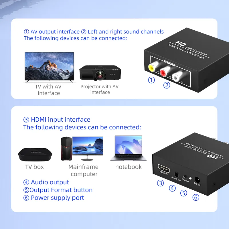 Quy trình kết nối cho sản phẩm này rất đơn giản. Đầu tiên, kết nối nguồn điện với thiết bị. Sau đó, sử dụng cáp HDMI chất lượng cao để kết nối thiết bị xuất tín hiệu với cổng đầu vào, cổng này cũng hỗ trợ cổng đầu vào âm thanh 3.5mm. Cuối cùng, sử dụng cáp AV (CVBS) chất lượng cao để kết nối thiết bị hiển thị với cổng đầu ra để hoàn tất thiết lập. |